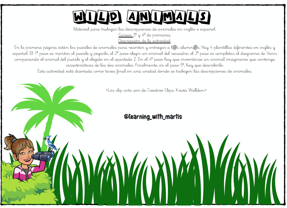 Descripciones de animales, realizando un diagrama de Venn para comparar dos animales salvajes, después hay que inventarse un animal fantástico con características de ambos animales y describirlo.