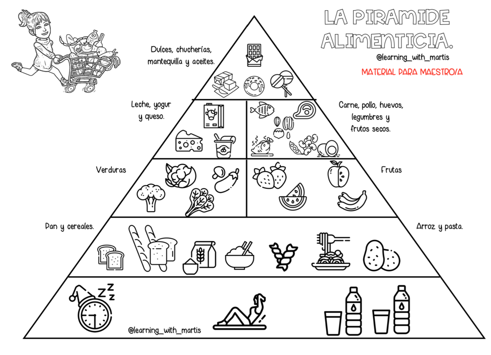 Material para trabajar la alimentación saludable, contiene una pirámide alimenticia recortable, un corazón plegable para esrcribir hábitos saludables y un flipbook sobre la digestión.